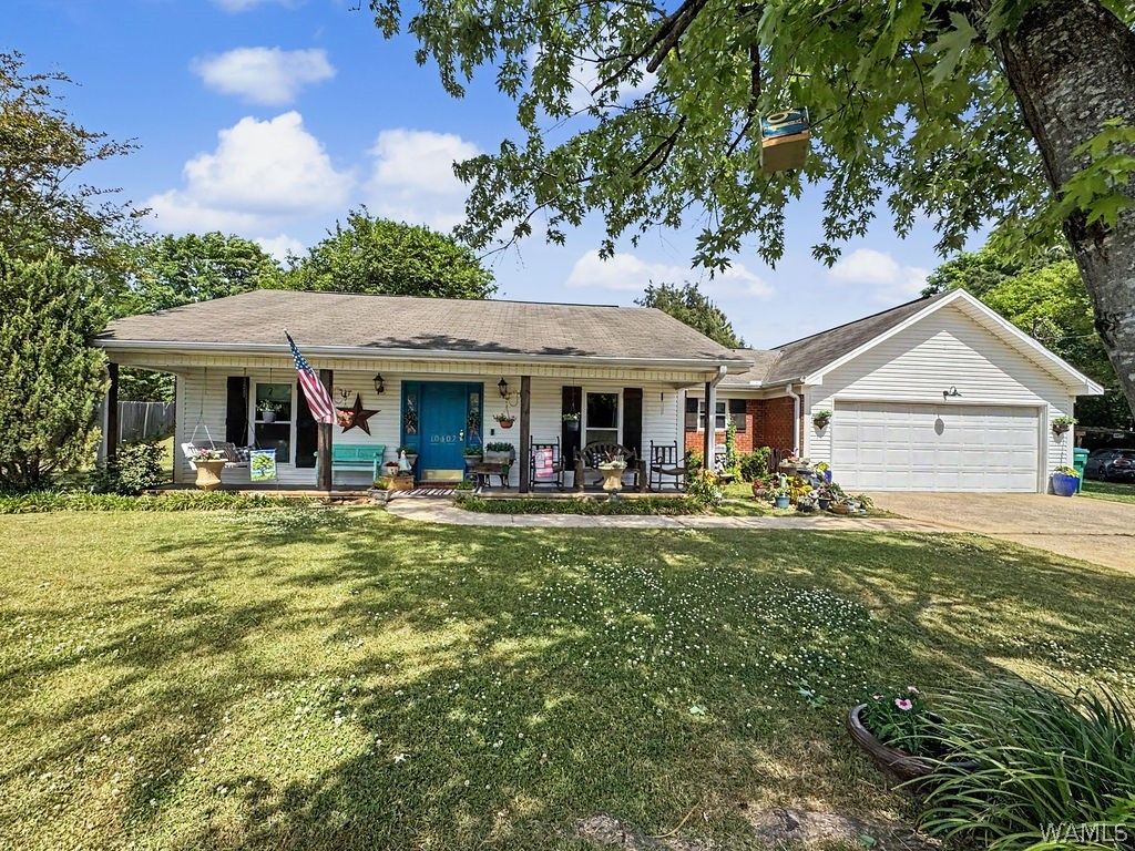 Welcome home to your own slice of Tuscaloosa charm! This 3 bedroom, 2 bath one-level home sits on over 1.5 acres and offers comfort, character, and room to spread out. Inside features a warm, inviting kitchen, dining area, and eat-in space perfect for gatherings. The living room showcases a beautifully redone fireplace. The primary suite includes a bath with separate his and hers sinks. Outside, enjoy the front porch, a large fenced backyard, and a covered patio with custom stonework, ideal for relaxing or entertaining. A garden area, multiple storage sheds, and a garage workbench room add extra function. This home is ready for its next owner.